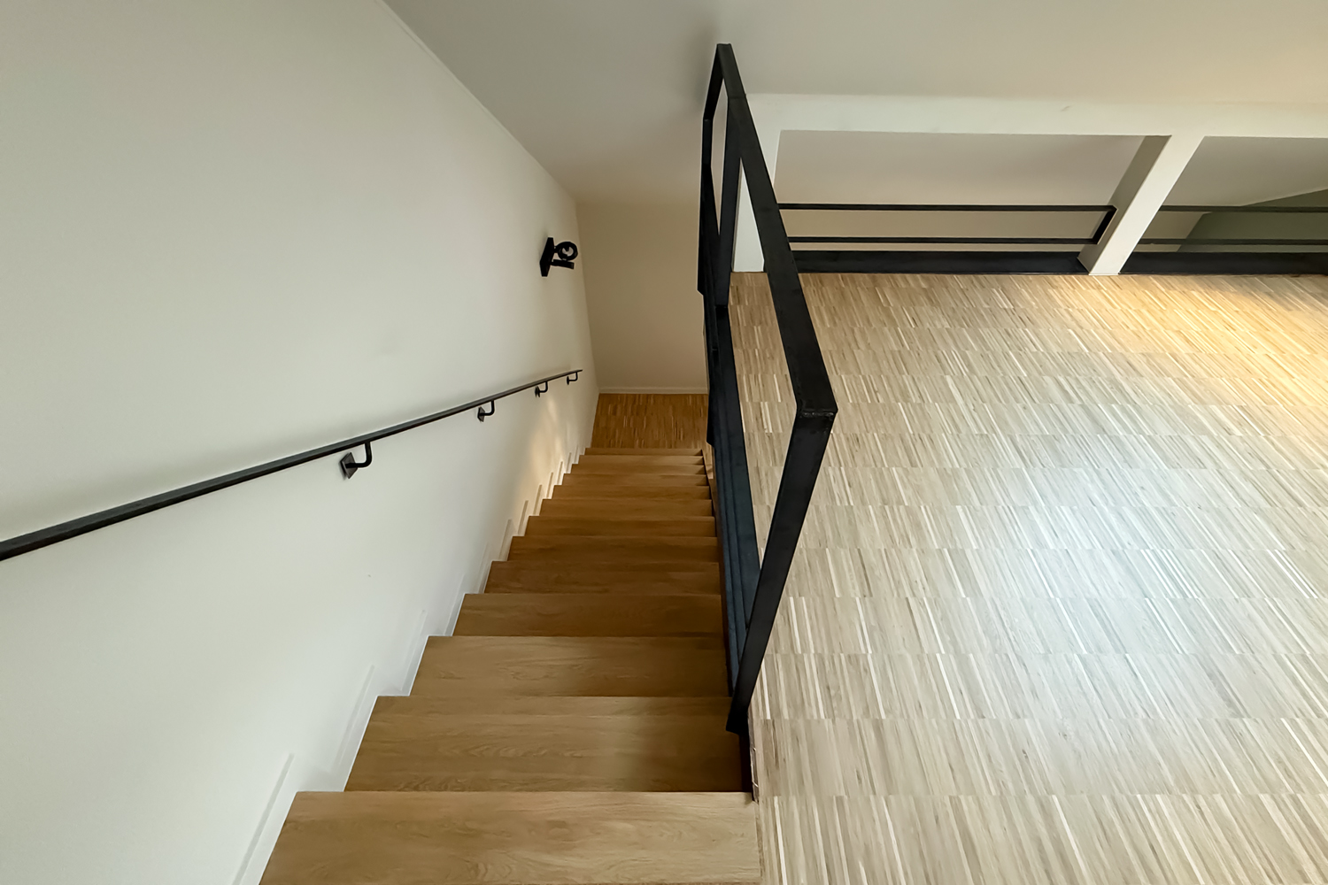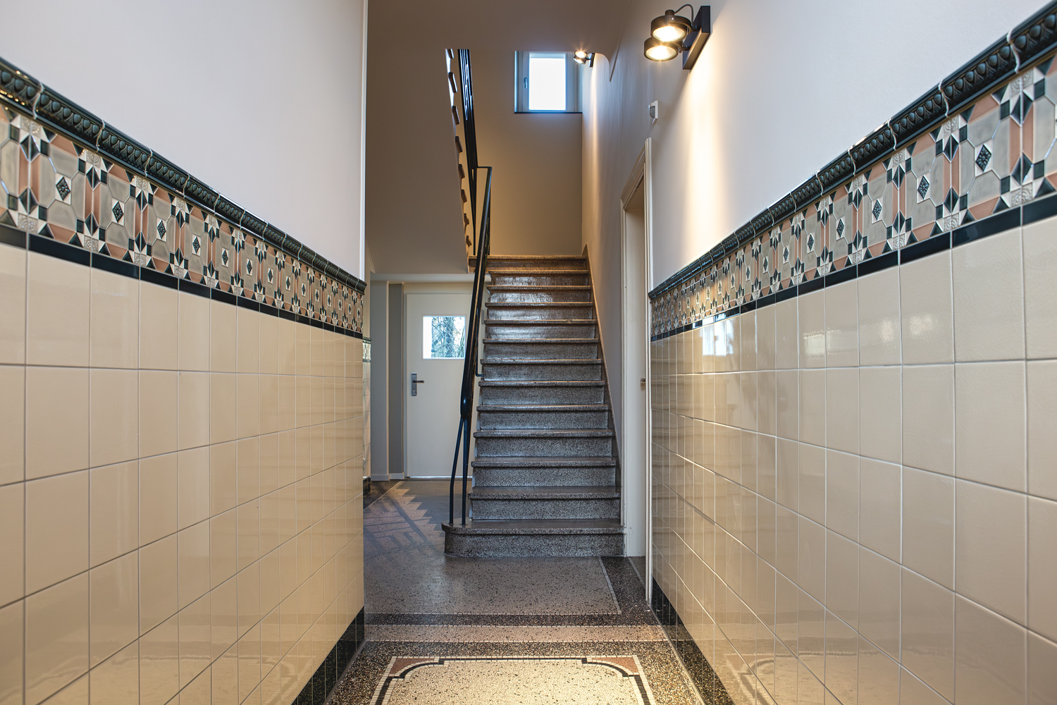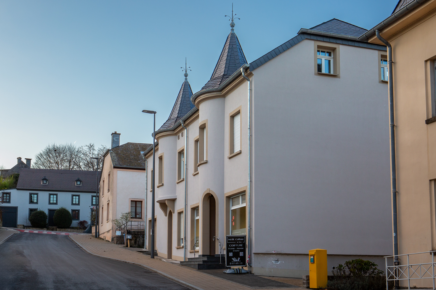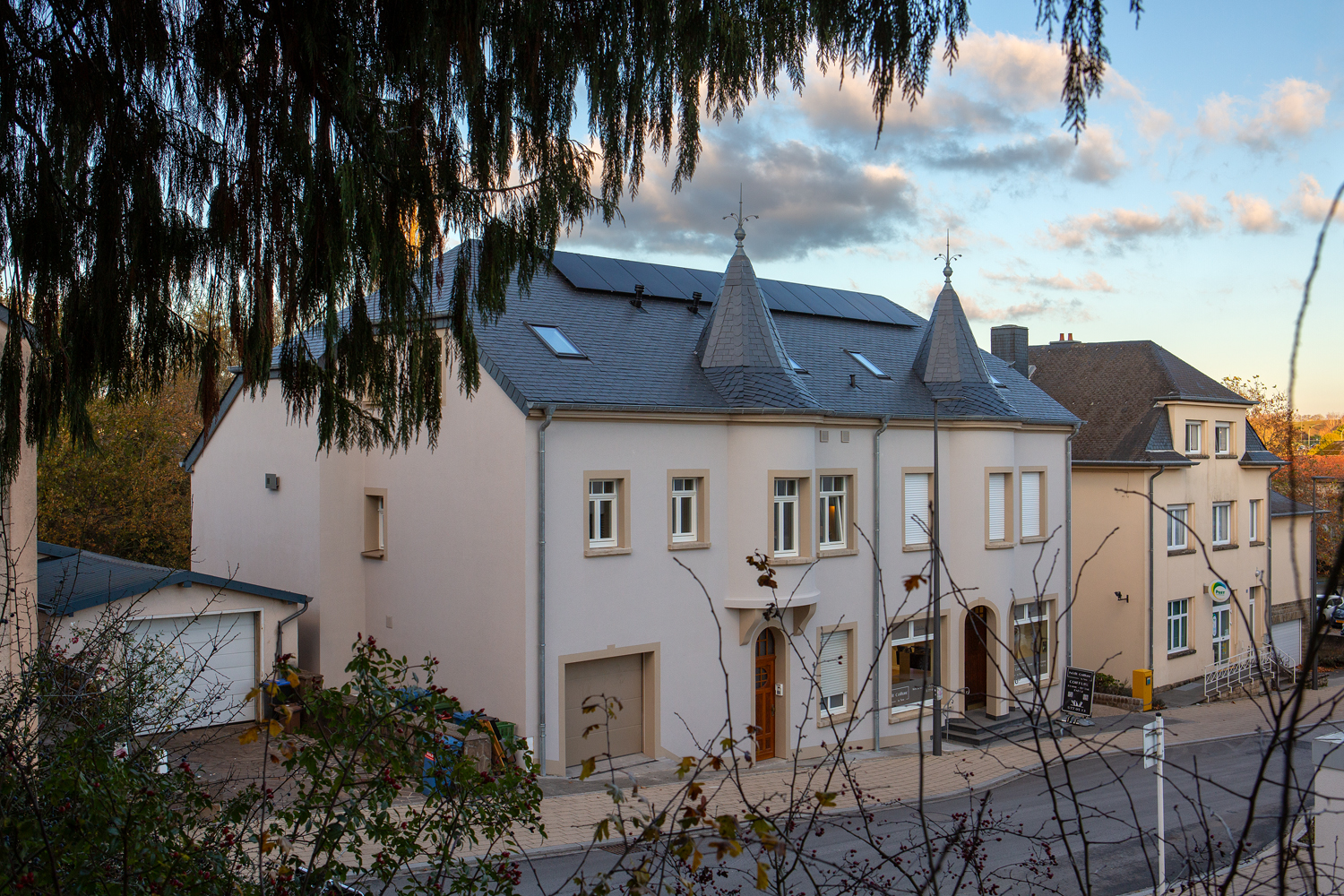 Au cœur de Roodt-sur-Syre, l’ancienne quincaillerie communale protégée, qui abritait aussi le logement familial du quincailler, a été transformée en trois logements et en un salon de coiffure. Le projet respecte l’architecture d’origine : la porte d’entrée a été reconstruite avec les panneaux en bois d’époque, la cage d’escalier en terrazzo et son garde-corps en fer forgé ont été restaurés, et un carrelage mural art déco complète l’ensemble. Les sols anciens, les menuiseries et luminaires soigneusement choisis créent une atmosphère chaleureuse. Derrière ce patrimoine préservé, le bâtiment intègre des technologies avancées et durables.