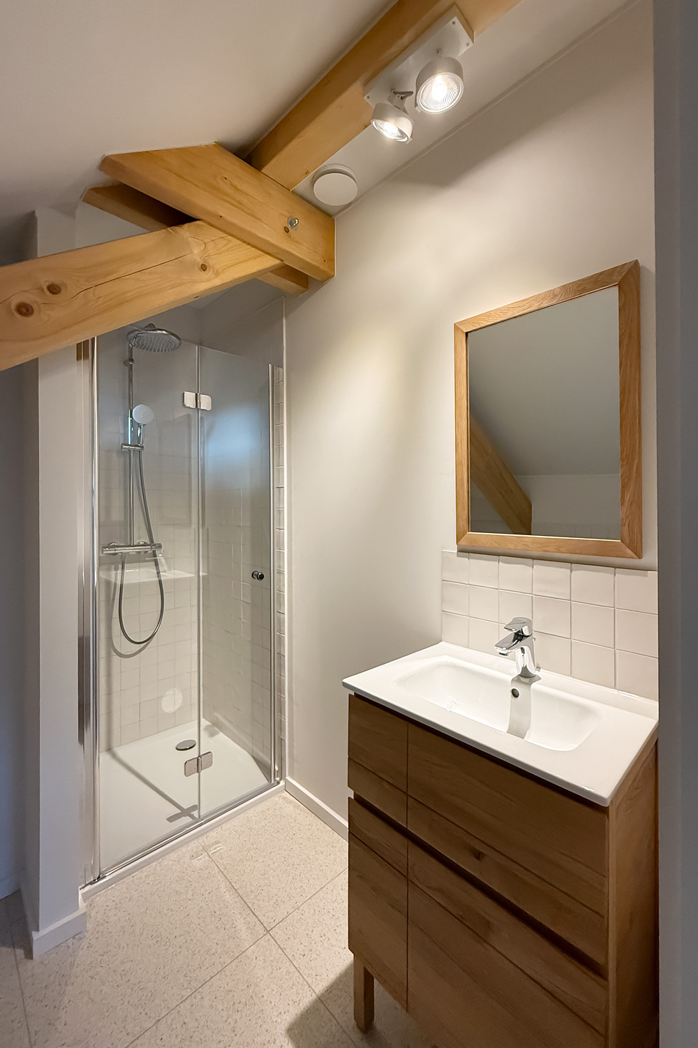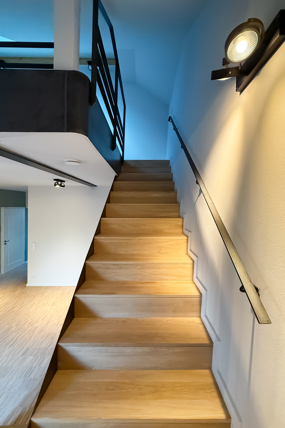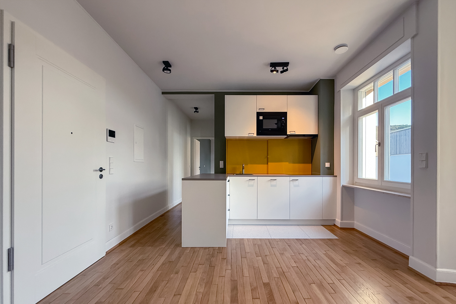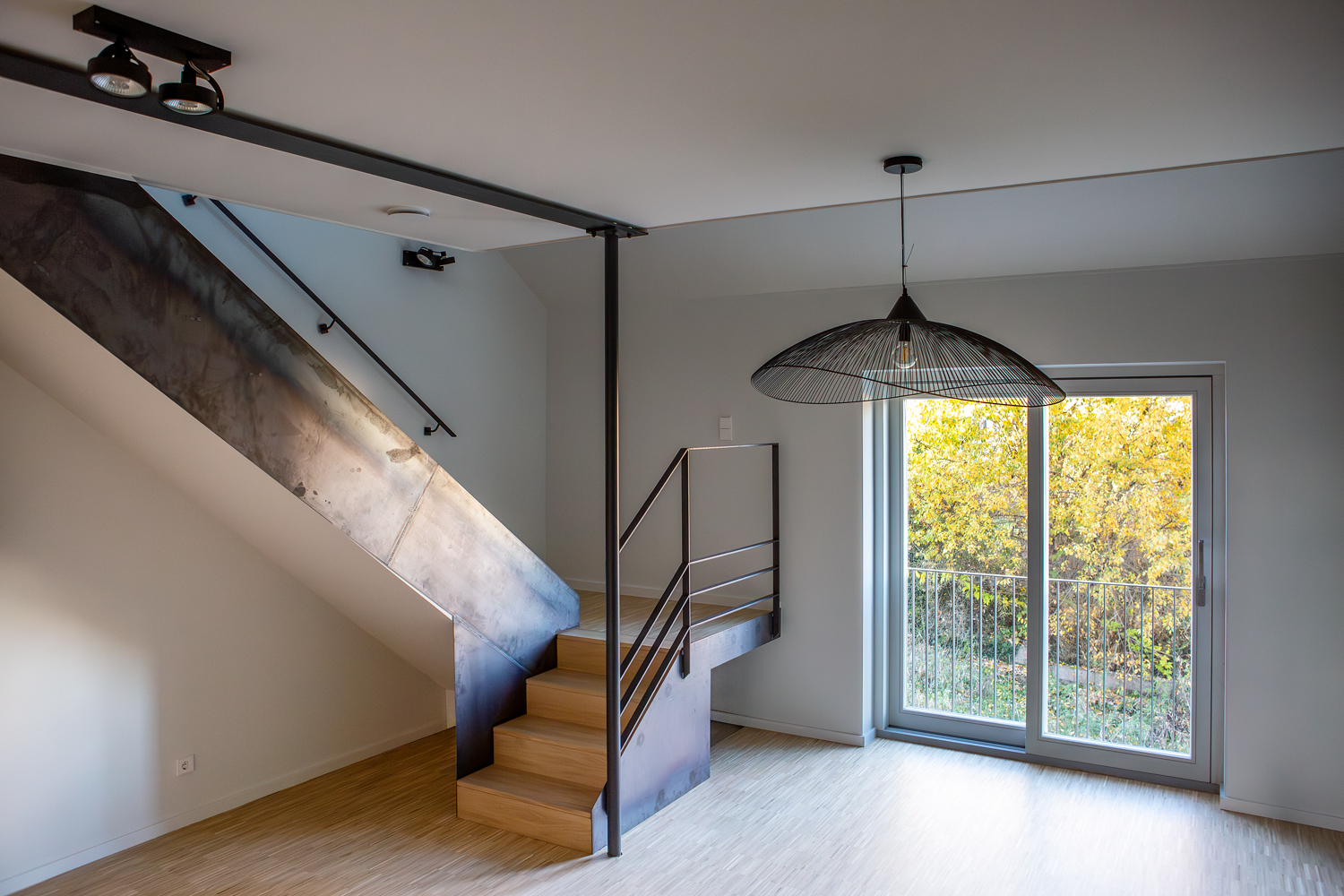Au cœur de Roodt-sur-Syre, l’ancienne quincaillerie communale protégée, qui abritait aussi le logement familial du quincailler, a été transformée en trois logements et en un salon de coiffure. Le projet respecte l’architecture d’origine : la porte d’entrée a été reconstruite avec les panneaux en bois d’époque, la cage d’escalier en terrazzo et son garde-corps en fer forgé ont été restaurés, et un carrelage mural art déco complète l’ensemble. Les sols anciens, les menuiseries et luminaires soigneusement choisis créent une atmosphère chaleureuse. Derrière ce patrimoine préservé, le bâtiment intègre des technologies avancées et durables.
